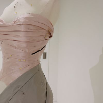 The centerpiece of the exhibit is a custom mannequin by Zac Posen, known for his painstaking attention to detail and draping. The mannequin wear a half-done evening gown in shades of pink and gray with a beautiful, long train — almost reminiscent of a fully-finished Comme des Garçons dress.