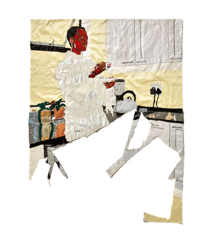 It was also the place where, Zangewa said, she saw her mother and other women find strength and healing in the quotidian: sewing, nurturing their children, and making homes for their families. It left a lasting impact on her, one that would manifest in her artwork: “I now experience it myself, how much effort it requires to keep a home together, to manage everyone’s emotions and to raise children, in my case a son, who will love and protect women. And all the while, you have to find ways to stay sane, to take care of yourself.” Zangewa’s depictions of women — walking a child to school, juggling a baby on one’s hip while trying to make breakfast, stealing away for a shower or a quick cup of tea alone at the end of the day — not only elevate women’s daily work and showcase acts of self-care, but also recognize the humanity of Black women in a way that the cultural imagination have not always permitted or embraced.