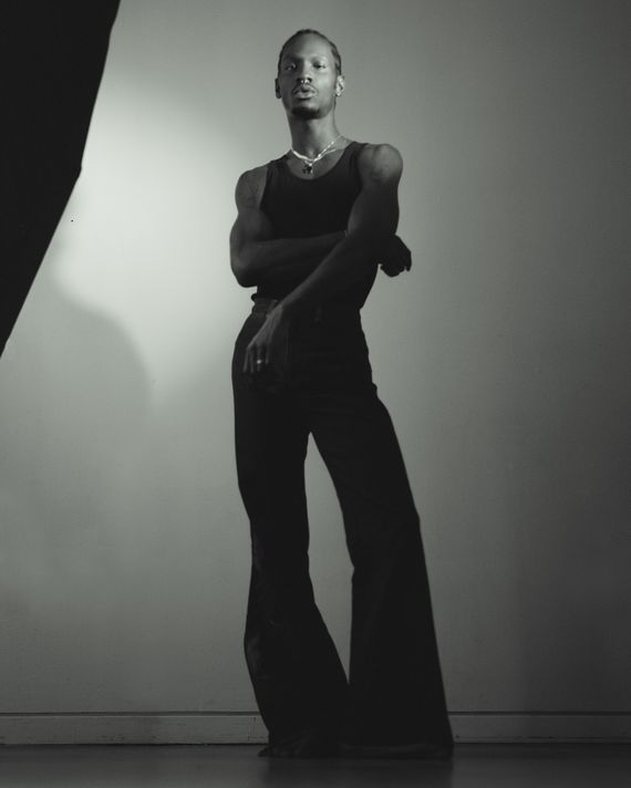 What helped was writing. A model’s life is not that different from a living mannequin’s, and fashion has a well-defended interest in projecting its own fantasies, and the sales pitches that gird them, onto the men and women it hires. “I was just a hanger,” Bosso says. “Fashion and media always portray Black men in a certain way, in a certain light. Nobody ever asked.” When he began making enough to stop doing the low-paying runway circuit, he began to turn the poems and journals he had written on the road into songs. He’d sang in a band in high school, but never got far with it. Now, encouraged by a friend with connections in the music world, he began taking it more seriously, teaching himself guitar via YouTube. He spent fashion week listening to Theophilus London; now, thanks to that same friend, a fellow African in L.A. with connections in music and fashion, he found himself in the studio with him, recording a first single. Today, modeling still pays the bills, but he finally has that voice: Adonis is a neo-soul crooner, in the vein of Maxwell or D’Angelo. His first public performance, back in 2018, bridged the two worlds: He sang, alongside Dev Hynes, Kelela, Kelsey Lu, and Ian Isiah at Telfar’s fashion show–cum-concert.